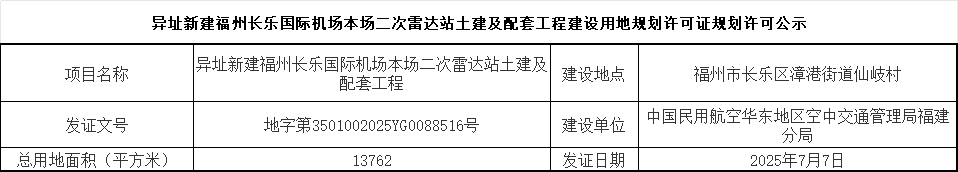 异址新建福州长乐国际机场本场二次雷达站土建及配套工程建设用地规划许可证规划许可公示