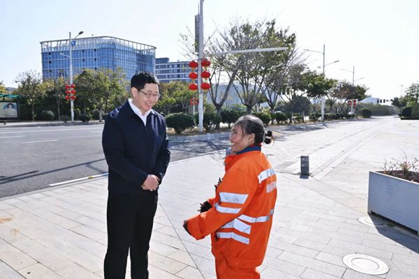 在东湖数字小镇,兰文与环卫工人罗永香亲切交流,详细了解她的家庭收入、工作生活等情况。得知罗永香来自云南,已在长乐工作多年,今年春节选择坚守岗位、就地过年。