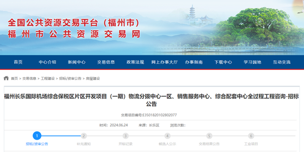 6月24日,全国公共资源交易平台福州市公共资源交易网发布福州长乐国际机场综合保税区片区开发项目(一期)物流分拨中心一区、销售服务中心、综合配套中心全过程工程咨询招标公告,项目建设又有新进展。