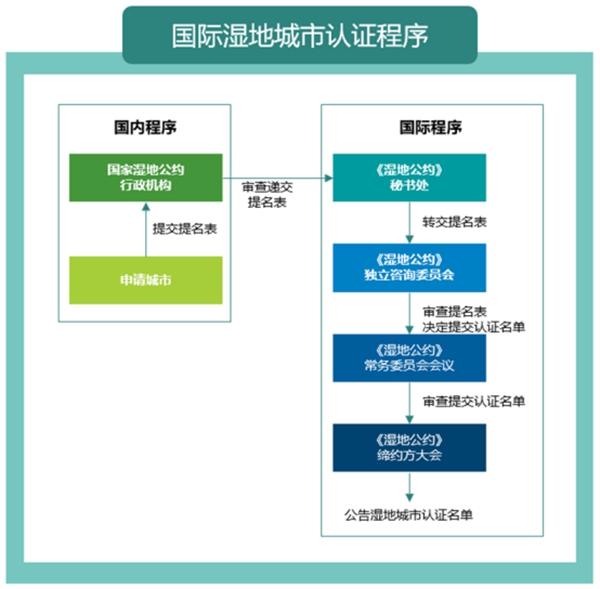 除了要满足公约组织制定的准则外,湿地城市认证还须经过国内、国际两轮严格审核。具体参见下图: