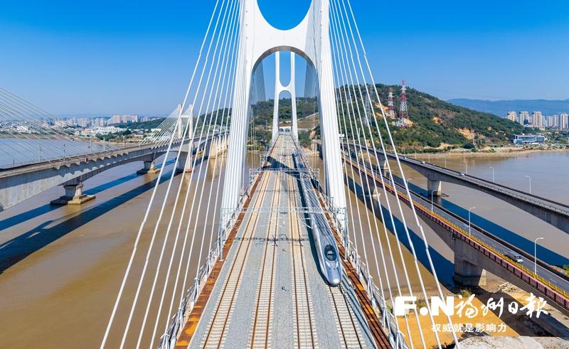 高铁列车组通过三江口大桥。记者 林双伟 摄