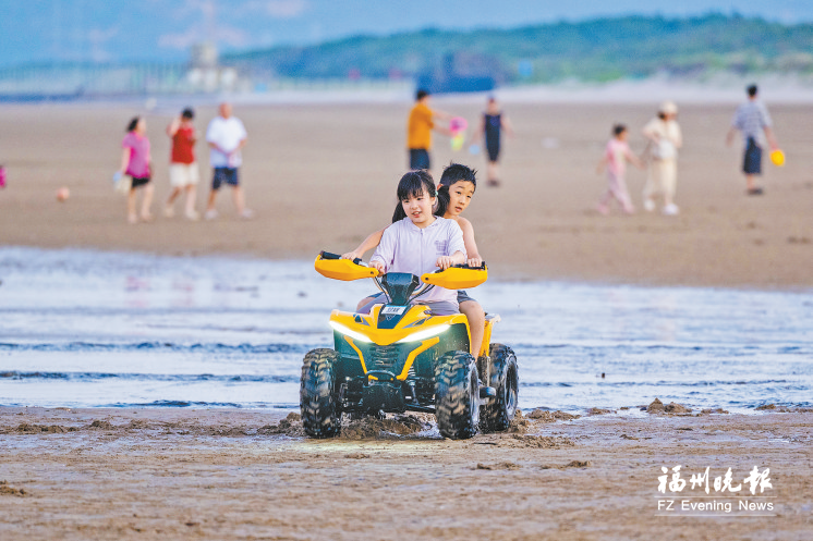 游客骑着沙滩车在下沙海滨游玩。