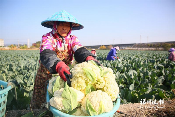 近日,福州新区(长乐区)古槐镇的万亩花菜种植基地迎来了集中采收期。